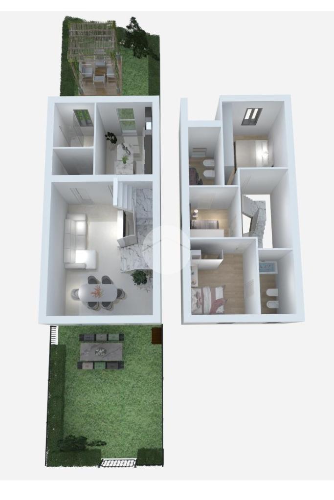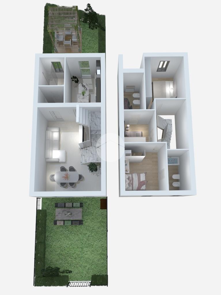 al piano terra si sviluppa la zona giorno composta da un ampio soggiorno e cucina separata, entrambi con accesso diretto al giardino privato, perfetto per momenti di relax e convivialità all’aperto; completa il piano un bagno finestrato.
